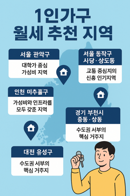 2025년 현재 대한민국의 1인 가구 비중은 전체 가구의 약 35%를 차지하며 지속적으로 증가하고 있습니다. 특히 자취를 시작하는 사회초년생, 프리랜서, 20~30대 직장인 중심으로 월세 수요가 높은 편입니다. 이에 따라 ‘가성비 좋은 월세 지역’과 ‘생활 인프라가 잘 갖춰진 거주지’가 1인 가구의 주요 선택 기준이 되고 있습니다. 이 글에서는 2025년 기준으로 추천할 만한 1인 가구 월세 지역 TOP 5를 소개하고, 각 지역의 특징과 장단점을 분석합니다.